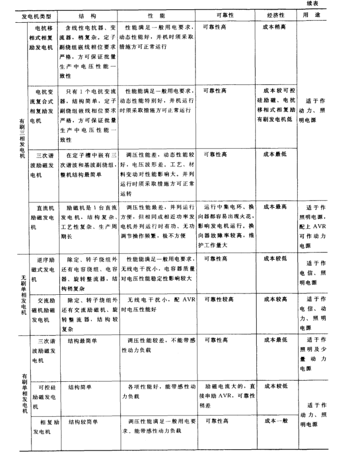 各類發(fā)電機的結構、基本性能、可靠性、經濟性、用途見表3-2。