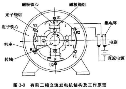 圖3-9是最簡單的4極交流三相發電 機工作示意圖。直流電源經電刷、集 電環向磁極繞組提供直流電流(即勵磁電流),根據通電線圈周圍產生磁場的原理,4個磁極鐵心便建立起極性分別為N、S、N、S的磁場。定子 鐵心槽中分別嵌有U、V、W 三相定子繞組。發電機轉子由發動機驅動,由于電磁感應作用,在定子繞組中便 感應出電動勢,當定、轉子鐵心尺寸和繞組匝數設計合理時,在額定轉速下發電機可發出額定電壓。