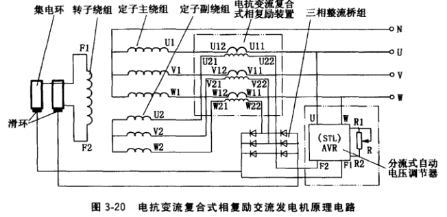 電抗變流復合式相復勵三相交流發電機原理電路如圖3-20所示。發電機由內燃機驅動至空載轉速為額定值附近時,依靠轉子鐵心剩磁磁場,發電機定子副繞組感應電壓經電抗變流器二次繞組的移相作用,提供一個建立發電機空載電壓的交流勵磁電流的電壓分量Ifu經三相整流橋組整流后向發電機轉子繞組提供空載勵磁電流。定子主繞組經串接電抗變流器 —次繞組后輸出三相電壓。當發電機帶上負載后,由電抗變流器的復勵作用,在二次繞組感應一個與發電機負載電流相對應的交流勵磁電流的電流分量Ifi,因此,負載時由Ifu和Ifi兩 個勵磁電流分量幾何疊加,并經三相整流,向轉子繞組提供負載勵磁電流,從而維持發電機端電壓恒定。不可控復合式相復勵發電機穩態電壓調整率一般不大于±5%。