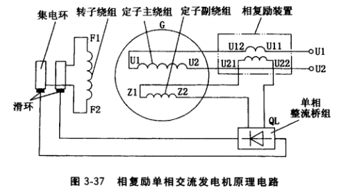 相復(fù)勵(lì)單相發(fā)電機(jī)原理電路 如圖3-37所示。發(fā)電機(jī)由發(fā)動(dòng)機(jī)驅(qū)動(dòng)至額定轉(zhuǎn)速附近時(shí),依靠轉(zhuǎn)子鐵心剩磁磁場,定子副繞組感應(yīng)的電壓經(jīng)電抗變流器二次繞組的移相作用,提供建立發(fā)電機(jī)空載電壓的交流勵(lì)磁電流的電壓分量,經(jīng)單相整流橋組整流后,向發(fā)電機(jī)轉(zhuǎn)子繞組提供空載勵(lì)磁電流,發(fā)電機(jī)很快自勵(lì)建立空載電壓。