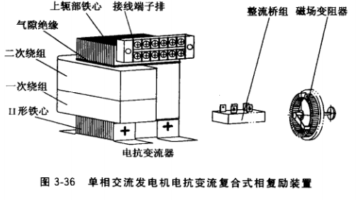 (2) 相復(fù)勵(lì)裝置。其外形、結(jié)構(gòu)如圖3-36所示,它包括電抗變流器、單相整流橋組和磁場變阻器。作為可控相復(fù)勵(lì)裝置,還必須外配分流式自動(dòng)電壓調(diào)節(jié)器。