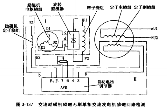 圖3-129中雙點劃線框內部分為這種發電機勵磁回路,它包括U相定子繞組、AVR (或整流橋組)、集電環、轉子繞組F1F2及各段連接線。