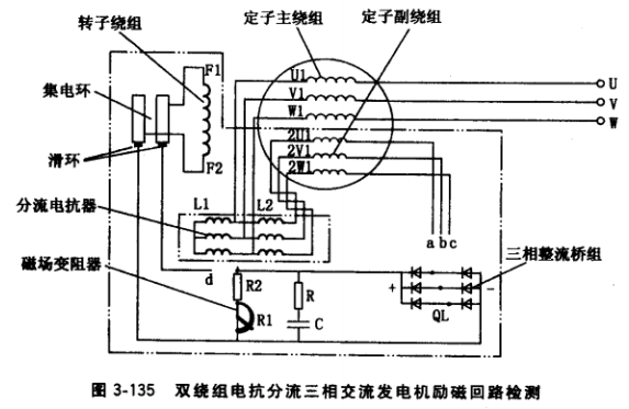 圖3-136雙點劃線框內的部分是這種發電機勵磁回路,包含定子副繞組Z1Z2、單相整流橋組QL、磁場變阻器R、集電環、轉子繞組F1F2及各段連接線。檢測前先拆開單相整流橋組交、直流側各一個接點,然后按以下順序檢測: