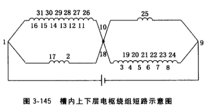 ③由于直流電壓是加在換向片1和9,根據圖3-143b可知16、17對1是等電位點,24、 25對9也是等電位點,用毫伏表測量相鄰片16、17及24、25片間電壓等于零或極小,不可誤認為短路。為了進一步判斷該兩處是否有短路,可分別測量1、16, 1、17, 24、9, 25、9片間電壓,讀數為零或極小者為短路。
