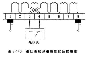(2) 用毫伏表沿第一支路依次測量與每個電樞繞組相連的片間電壓,當片間電壓從小值 突變為大(或從大變小)值時,記下突變點的換向片號。接著,從同一起始端開始沿另一支 路依次測量與每個電樞繞組相連的片間電壓,當片間電壓從大值突變為小值(或從小值突變 為大值〉時,也記下突變點的換向片號,當該兩換向片所連繞組同在一個槽時,該槽上下層 繞組必有短路。