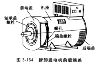 (3)拆前、后端蓋。先松開(kāi)的、后軸承蓋螺栓,卸下前軸承蓋,松開(kāi)前后窗蓋板螺釘, 卸下前后窗蓋板,看到前端蓋與定子機(jī)座連接螺栓,如圖3-164所示。用呆扳手或梅花扳手松開(kāi)并退岀端蓋螺栓,把該端蓋螺栓旋人附近的兩個(gè)對(duì)稱(chēng)分布的螺孔,隨著2個(gè)螺栓不斷推進(jìn),頂向定子機(jī)座止口端面,便逐步退出端蓋,直至端蓋脫離機(jī)座止口。與此同時(shí),端蓋軸承室也隨著脫離軸承,把前、后端蓋卸下。