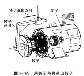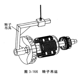 (4)退出轉(zhuǎn)子。用圖3-165所示吊具,套入轉(zhuǎn)子軸伸端,輕輕吊起轉(zhuǎn)子,沿箭頭方向緩緩?fù)顺鲛D(zhuǎn)子。不須拆彈性聯(lián)軸器或盤(pán)式柔性聯(lián)接片的發(fā)電機(jī)轉(zhuǎn)子退出法:由人工邊轉(zhuǎn)動(dòng)轉(zhuǎn)子邊軸向退出轉(zhuǎn)子,當(dāng)轉(zhuǎn)子鐵心段剛露出定子機(jī)座時(shí),用粗麻繩圈套鐵心外徑,輕輕吊起轉(zhuǎn) 子,緩緩?fù)顺鲛D(zhuǎn)子。不管采用以上哪種方法,退出轉(zhuǎn)子過(guò)程切不可碰傷定子繞組。退出轉(zhuǎn)子后如圖3-166所示,仍由吊具吊運(yùn)轉(zhuǎn)子然后輕放在干凈、可靠的臺(tái)架上。