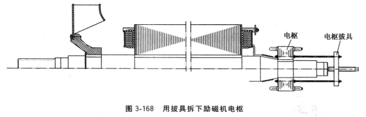 (8)拔出勵(lì)磁機(jī)電樞。勵(lì)磁機(jī)電樞一般位于轉(zhuǎn)子后端,可利用電樞鐵心軛部4個(gè)通孔,裝上4根長(zhǎng)螺桿,用圖3-168所示電樞拔具,卸下電樞。