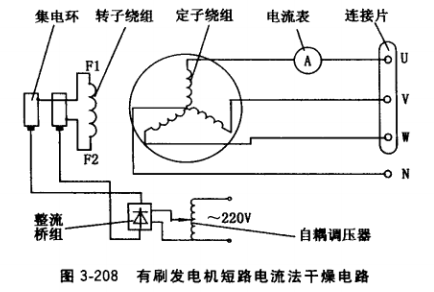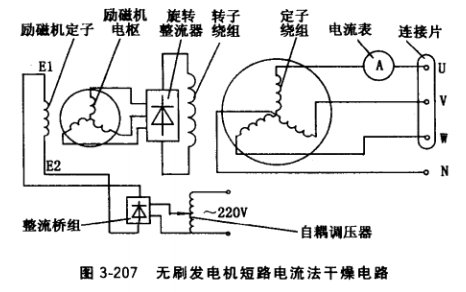 (1)短路電流法電路。無刷發(fā)電機、有刷發(fā)電機短路電流法干燥電路見圖3-207、圖3-208。