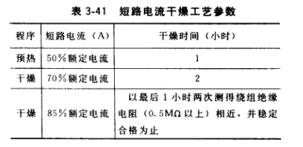 (2)干燥步驟及工藝參數(shù)。短路電流干燥工藝參數(shù)見表3-41。機端經(jīng)交流電流表A后,三相線端U、V、W用連 接片短路。起動內(nèi)燃機使發(fā)電機接近額定 轉(zhuǎn)速,調(diào)節(jié)自耦調(diào)壓器提高其輸出電壓, 經(jīng)整流器向勵磁機定子繞組(或發(fā)電機轉(zhuǎn)子繞組)提供勵磁電流,定子三相繞組感應(yīng)三相短路電流,發(fā)電機便發(fā)熱干燥。調(diào)節(jié)自耦調(diào)壓器輸出電壓,可調(diào)節(jié)定子短路電流大 小。每半小時測量記錄一次繞組絕緣電阻,直至符合要求。