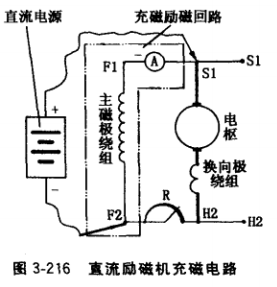 圖3-216中雙點劃線范圍為充磁勵磁回路,包括直流直 流電源 充磁勵磁回路電流表“ + ”端、“-”端、定子主磁極繞組。充磁前勵磁機充磁勵磁電路應完好,勵磁機處于停機或運轉(zhuǎn)狀態(tài)。6?12V直流電源“+”極觸直流電流表“+”端,“-”極觸定子主磁極繞組“F2” 端,此時直流電流表表針正向偏轉(zhuǎn),說明定子主磁極繞組中有直流電流通過,完成充磁工作,即可脫離直流電源。有的勵磁機未裝勵磁電流表,且試驗臺上也未裝勵磁電流表,則最好在勵磁機旋轉(zhuǎn)情況下充磁,觀察交流電壓表有電壓指示,且脫離充磁電源后勵磁機能維持電壓,即完成充磁。若充磁直流電源“ +”、“-”極與定子繞組“F1”、“F2” 反接時,則直流電流表表針反向偏轉(zhuǎn),電樞感應的電壓極性隨之改變,也就是勵磁機輸出電壓的“ +”、“-”端改變,影響勵磁機正常使用。