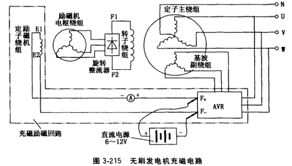 圖3-215中雙點劃線范圍為充磁回路,包括AVR自動電樂調(diào)節(jié)器輸出端“F+”、“F-”端、直流電流表、勵磁機定子繞組端點E1、E2。充磁前發(fā)電機充磁勵磁電路應完好,發(fā)電機處于停機或運轉(zhuǎn)狀態(tài)。6?12V直流電源“+”極觸AVR的“F1”端(或“+”端), “-”極觸AVR的“F2” 端(或“-”端),此時直流電流表表針正向偏轉(zhuǎn),說明轉(zhuǎn)子繞組中有直流電流通過,完成充磁工作,即可脫離直流電源。有的發(fā)電機未裝勵磁電流表,且試驗臺上也未裝勵磁電流表,則最好在發(fā)電機旋轉(zhuǎn)情況下充磁,觀察交流電壓表有電壓指示, 且脫離充磁電源后發(fā)電機能維持電壓,即完成充磁。