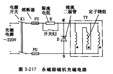 ①接線。如圖3-217所示,把永磁機定子三相繞組任一相反相,然后三相繞組并聯(lián)連接。續(xù)流二極管D用于在切斷充磁電源時,給定子三相繞組儲能提供放電回路,以免繞組產(chǎn)生過電壓而導致定子繞組絕緣損壞。限流電阻 R可用500?1000W電阻爐或同容量燈泡。開 關(guān)K2與電阻R并聯(lián),K2合上時,將電阻R短 路。直流充磁電源經(jīng)開關(guān)K1、熔斷器FU后 接入。