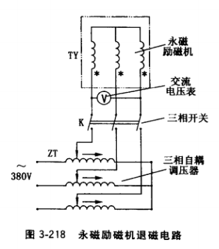(2)永磁勵磁機退磁。當永磁勵磁機運行時電壓 太高或充磁時磁通最過多使永磁機電壓太高時,必須 實施退磁使電壓符合要求。