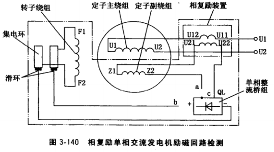 ⑤勵磁回路斷路或接觸不良。圖3-140雙點劃線框內為這種發電機勵磁回路,包含定子副繞組、相復勵裝置(電抗變流復合)、單相整流橋組、集電環、轉子繞組及各段連接線。 當該電路斷線或電氣接觸嚴重不良(如接線頭嚴重氧化、松脫,變阻器接線縲栓松動等) 時,發電機無勵磁電流。