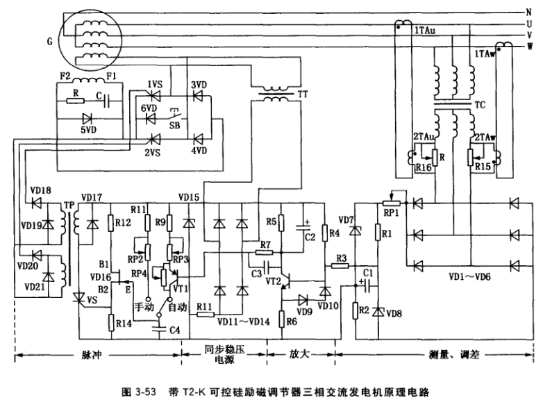 (2)原因分析。由于無刷發電機交流勵磁機的勵磁功率小,勵磁調節器通常使用單結晶體管觸發電路(見圖3-53),因此上述現象主要是由于可控硅勵磁調節器故障所致。