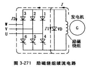 (2)原因分析??煽毓鑴畲耪{節器的續流管開路 或通態正向電阻變大,脈沖突然消失,可控硅維持電流太小,正向阻斷電壓下降。因為可控硅整流橋的負載——發電機轉子是個大電感,通過它的電流是不能突變的。發電機運行中,當可控硅整流橋輸出的電壓過零時,轉子將產生一個與勵磁電壓極性相反的反電勢,通過續流管VD和二極管及未關斷的可控硅(如 W相二極管3和可控硅6)續流(如圖3-271虛線所示),續流電流I=I1+I2。在正常情況下,由于續流管的通態正向電阻小,續流電流基本上從續流管通過,流過二極管和未關斷可控硅的續流電流I2很小。但若續流管開路或通態正向電阻大,則續流電流全部或大部分從W相可控硅流過。當續流電流I2大于可控硅的維持電流時,可控砘將繼續導通.直至U相可控硅導通, 強迫其換相才能關斷。但此時若三相脈沖(或U相脈沖)突然消失,則W相可控硅關不斷,將一直導通到承受來自電源的正向電壓,接著全導通。如此循環,使可控硅完全失控, 成為不可控整流。