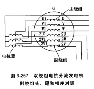 ①改變主、副繞組的相位,減弱相補償作用,使發電機外特性變軟,以適應并列運行。常見的接線方法有:一是將副繞組的頭、尾對調,如圖3-266所示。此種接法,并列運行時無沖擊電流,有功轉移正常,但無功輸出小,cosφ只能在0.95?1變化,且cosφ減小時發電機端電壓下降快,起動大容量電動機困難,單機運行不好;二是將副繞組頭、尾和相序調換,如圖3-267所示。此種接法,并列運行無沖擊電流,無功功率轉移正常,cosφ能在0.5?1變化,運行良好。由于主、副繞組相位變化,會使勵磁電流增大,電壓上升,需適當調節電抗器氣隙及匝數比, 調節得當能使cosφ=0. 7?0.9時,電壓調整率接近或等于±5%。但在cosφ減小時,電壓下降快,單機運行不好。