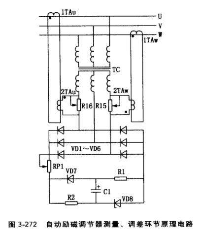 (2) 原因分析??煽毓鑴畲耪{節器為了使發電機在并網運行時能合理分配無功,一般都 設有調差裝置,在接線上有單相調差、兩相調差和三相調差等。下面就以兩相調差為例說明接線錯誤引起無功電流一直上升的原因。圖3-272是勵磁調節器的測量、調差環節(調節器電路見圖3-53) 測量變壓器TC和測量橋VD1?VD6等組成了調節器的電壓測量環節。當發電機電壓上升時,測置橋輸出信號增大,此信號與比較橋(由R1、R2和VD7、VD8組 成)比較和放大器放大后,將使觸發脈沖后移,勵磁電流減小,從而使發電機電壓下降,恢復到接近原來的電壓值。相反,將使發電機端電壓增加,以維持發電機端電壓在一定范圍內。