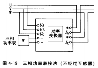 (1)接入三相功率表的三相電壓和電流均未經 互感器,而直接接到功率變換器上,三相功率經變換器變換后再接到功率表進行讀數,如圖4-19所 示。這種接法用于測量電壓400V、電流5A以下 的小功率。