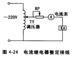 ③電流繼電器KAU (或KAV或KAW)整定(見圖4-24)。斷開KAu (或KAV.、KAW) 線圈的外接線,將它與變阻器RP,電流表A串聯(lián)后,接入調(diào)壓器TY的輸出端。將調(diào)壓器 輸出調(diào)至0,變阻器RP調(diào)至敢大阻值并在TY輸入端接入交流220V電源。先將KAu (或 KAV、KAW)整定旋鈕轉(zhuǎn)至最大整定值位置,然后慢慢調(diào)節(jié)調(diào)壓器的輸出電壓(粗調(diào))并 減小變阻器R阻值(細(xì)調(diào)使通過KA,,(或KAV、KAW)線圈電流達(dá)到整定值,再將繼 電器整定旋鈕往整定值小的方向慢慢旋轉(zhuǎn),使繼電器動作,常開觸點閉合-接著把調(diào)壓器回 調(diào),使繼電器常開觸點斷開.然后將調(diào)壓器輸出增大,使電流達(dá)到整定值,看繼電器是否動 作,若不動作或動作過早再來回整定幾次,直到繼電器動作值與整定值相符為止。最后將調(diào) 壓器輸出電壓調(diào)至0,變阻器阻值調(diào)至最大。
