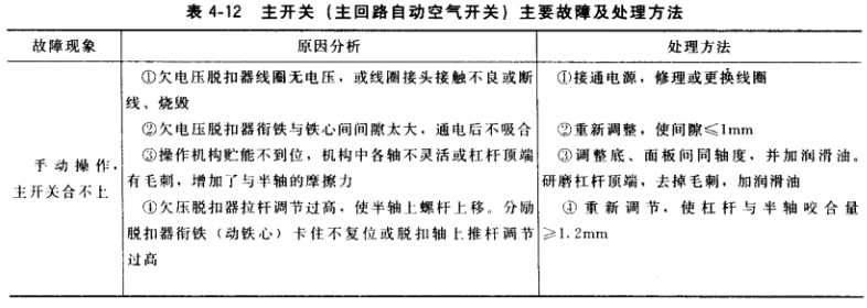 (4)主開關(guān)檢測。發(fā)電機(jī)控制屏主開關(guān)是指一次回路的自動空氣開關(guān),它起著一次回路的通、斷作用,對發(fā)電機(jī)向外安全供電很重要。除定期檢修外,如發(fā)現(xiàn)異常現(xiàn)象(如發(fā)熱、 火花、燒焦等)要及時檢査、處理。主開關(guān)主要故障現(xiàn)象、原因分析及處理方法見表4-12。
