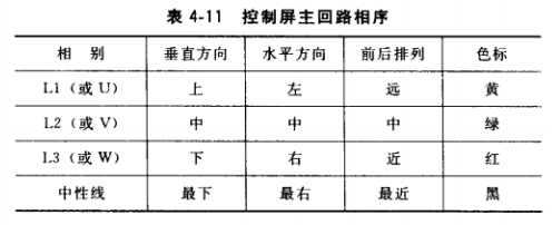 (1)相序檢測。從控制屏的正面看,控制屏主回路母線相序排列和色標(biāo)應(yīng)符合表4-11 規(guī)定,接入控制屏的電壓相序應(yīng)與上述規(guī)定相符。