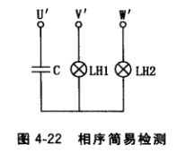相序可用相序儀檢測。在現(xiàn)場,也可用簡易方法檢測。如圖4-22所示,用2只220V、 50W燈泡和一只3μF、250V電容器接成Y形接線,U'、V'、W'分別與待測互感器U、V、 W相連接,若燈LH1比LH2更亮,則相序正確,否則相序錯接,應(yīng)更正。