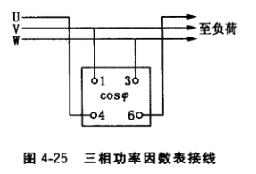 (2)原因分析。三相功率因數(shù)表的接線圖如圖4-25所示,其電流線圈接U相電流矢量為Iu電壓線圈接線電壓矢量為UVW,它們的矢量圖如圖4-26所示。的相位角差為π/2-φ,功率因數(shù)表流過表頭的電流設(shè)計成與cos(π/2-φ )成比例,并使φ=0,即 cos (π/2-φ )=cos π/2 = 0時作為機械零點,使之處于儀表的中間指示(即作cosφ=1.0指示)。因此,當負荷為感性φ= π/2 (滯后),cos (π/2-φ)=cos (π/2 —π/2) =1.0時,流過表頭的電流最大,指針向右(滯后區(qū))偏轉(zhuǎn),所示的功率因數(shù)為滯后時的最小值; 而當負荷為容性φ=90° (超前),cos(π/2+π/2) =cosπ=-1.0時,流過表頭的電流也最大,但方向相反,所以指針向左(超前區(qū))偏轉(zhuǎn),所示的功率因數(shù)為超前時的最小值。功率因數(shù)表能正確 測量電源的功率因數(shù),因此,產(chǎn)生功率因數(shù)表指示相 反的原因可能有: