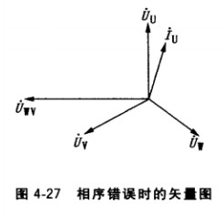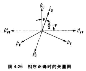 ③接入功率因數(shù)表的三相電源相序接錯,如圖4-27所示,同樣使IU與Uwv相角差大于π/2,所以也造成指示相反。