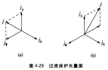 當接線極性正確時,流過V相過流繼電器的電流矢量如圖4-29a所示,即I=IU +IW(幾何合成)=-IV ,IU、IW與I大小相等,V相過流繼電器不會發(fā)生誤動作。但當TAW(或TAU)的一次(或二次)的極性接錯時,則流過繼電器的電流如圖4-29b所示,即I =IU+(-IW)(幾何合成),其中I、IU、IW大小不等,且I比IU、IW大倍,因此過流繼電KV動作,使開關(guān)跳閘。