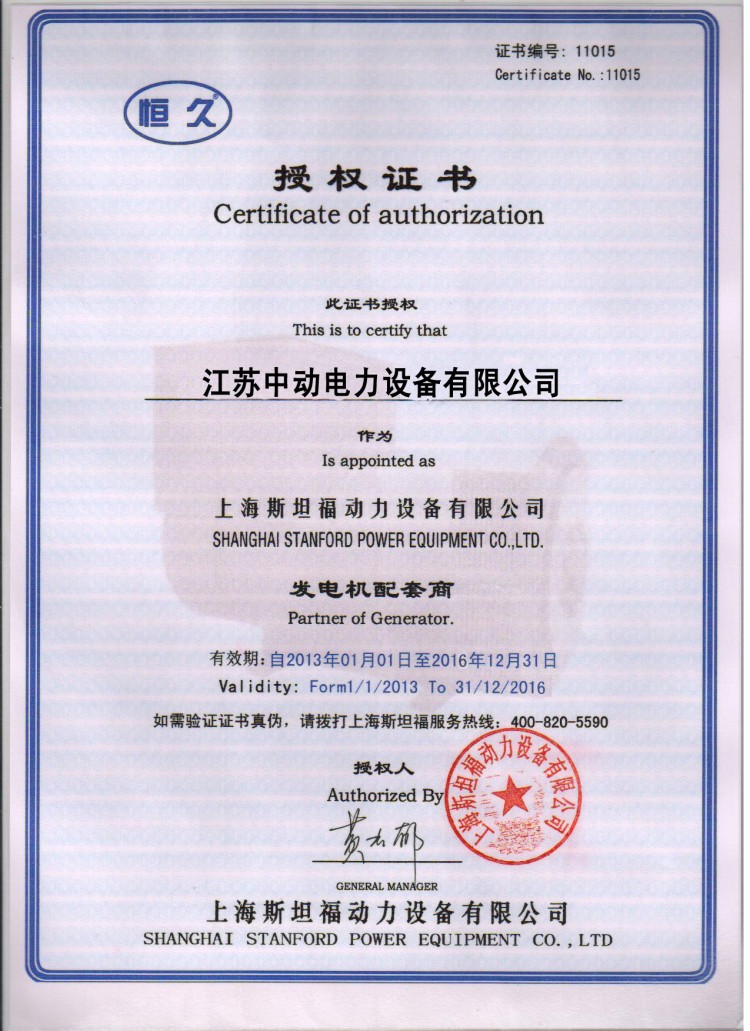 上海斯坦福動(dòng)力設(shè)備有限公司授權(quán)江蘇中動(dòng)電力設(shè)備有限公司作為發(fā)電機(jī)配套商